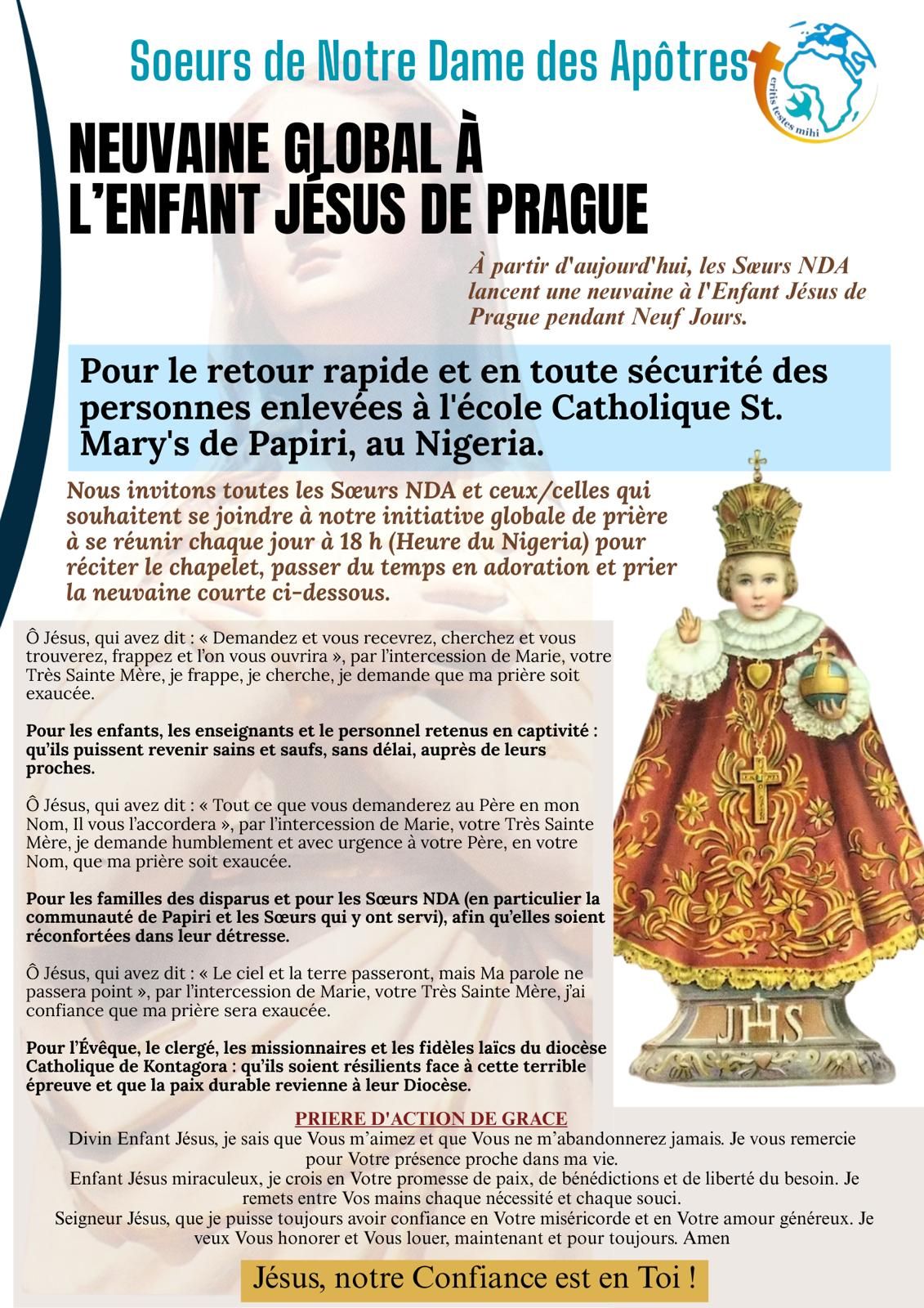 En parallèle, les Sœurs Notre Dame des Apôtres invitent tous ceux qui le souhaitent à se joindre à une initiative mondiale de prière et à se réunir tous les jours à 18 h, heure du Nigeria, pour réciter le rosaire, passer un moment en adoration et prier la courte neuvaine pour la libération et le retour en toute sécurité des élèves, étudiants et enseignants.